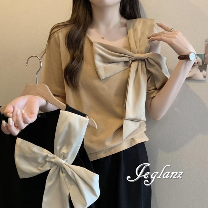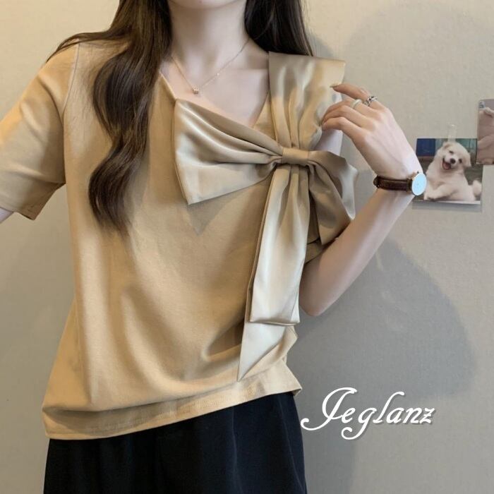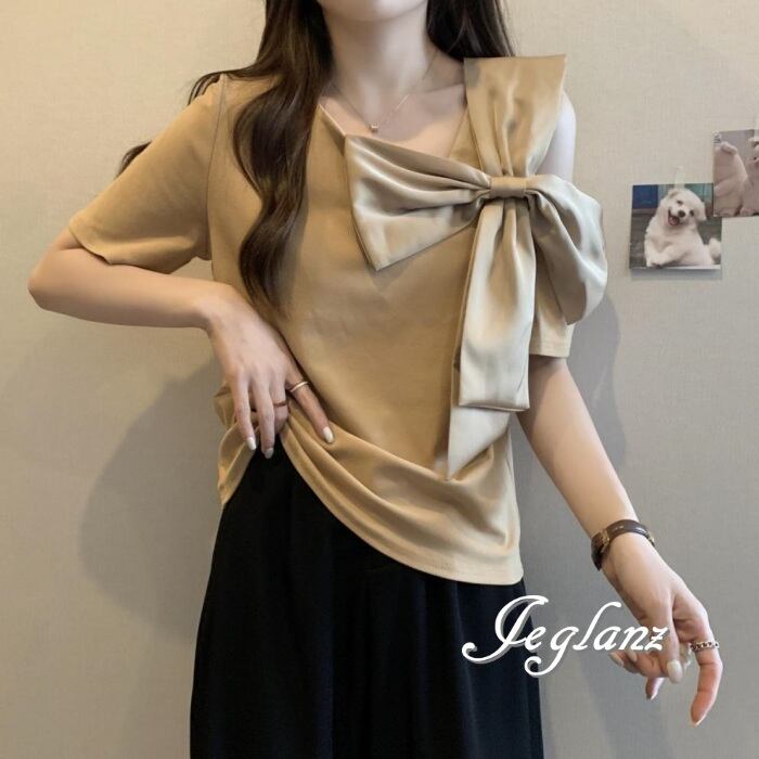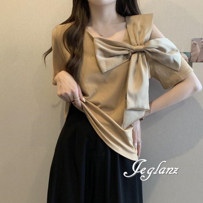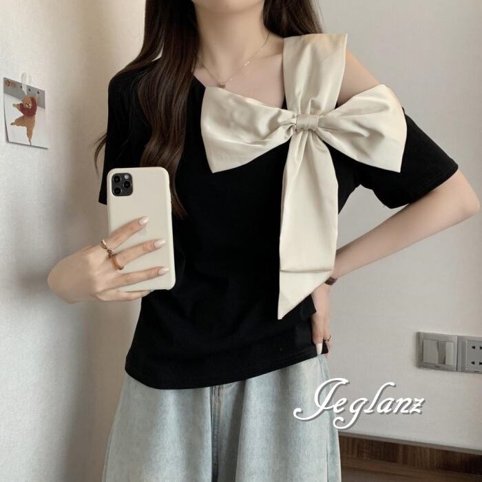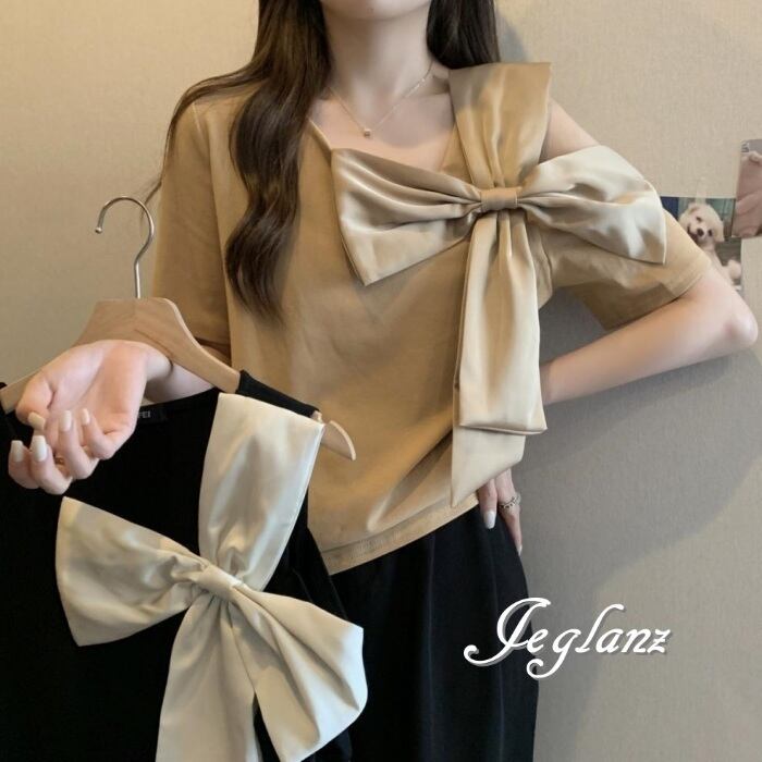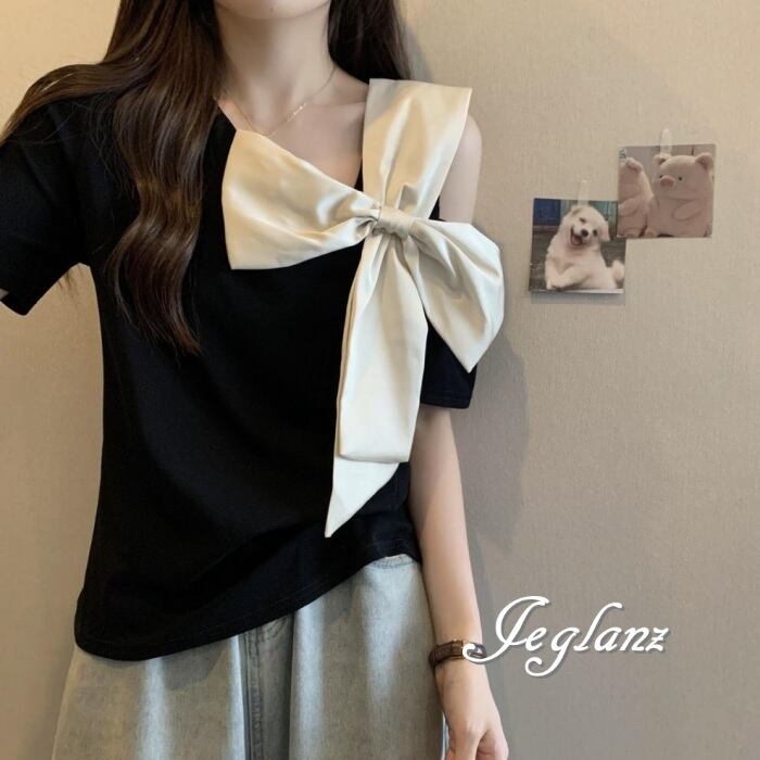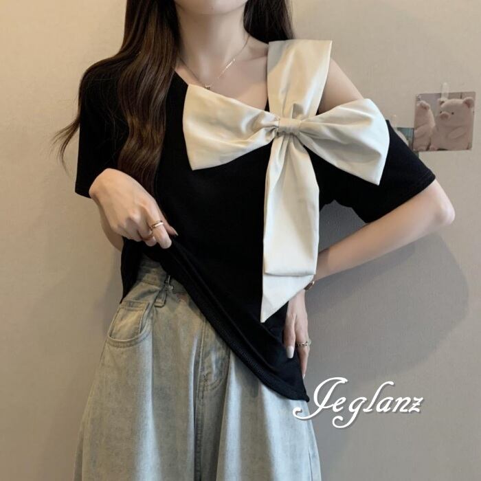 2色 Tシャツ カットソー トップス オープンショルダー リボン ♪(MA347)ρ