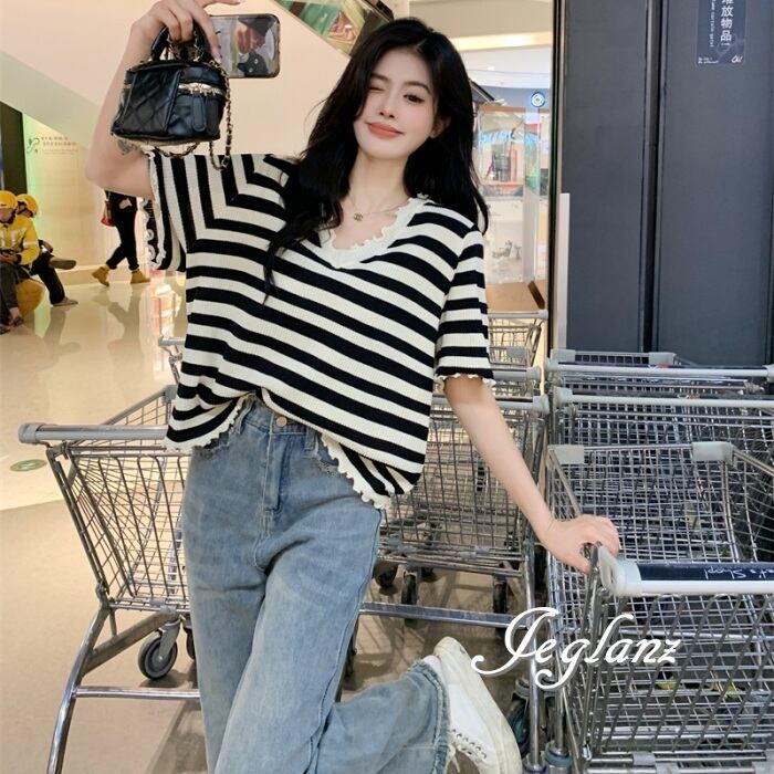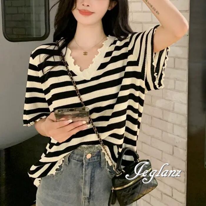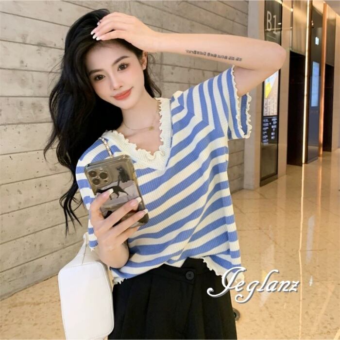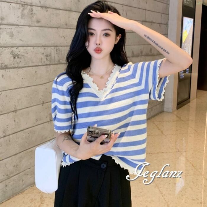 2色 サマー ニット マルチボーダー フリルカラー Vネック(MA409)ρ