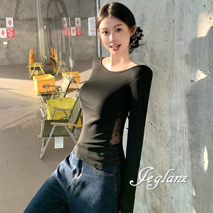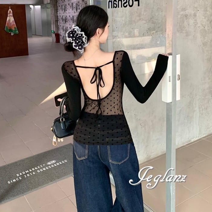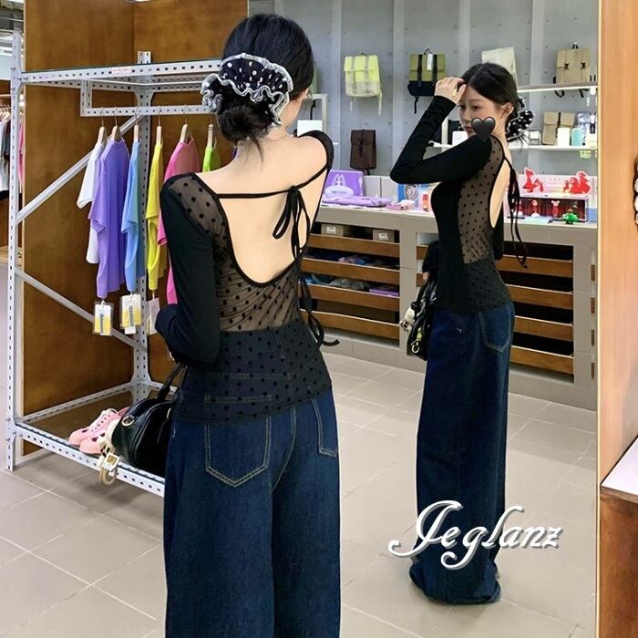 Tシャツ カットソー ブラウス 異素材 水玉 バックシャン 肌見せ(MA688)σ,ς*