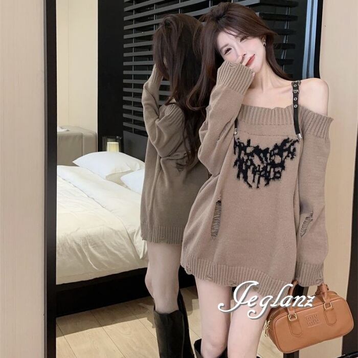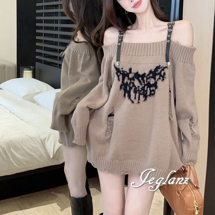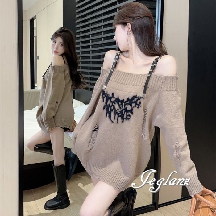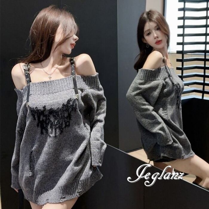2色 ダメージ ニット セーター チュニック スタッズベルト (MA689)σ,ς*