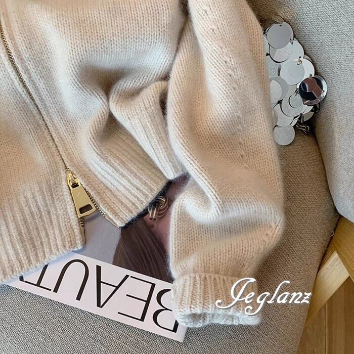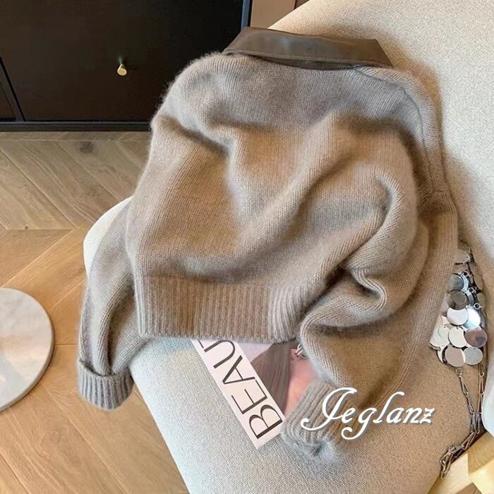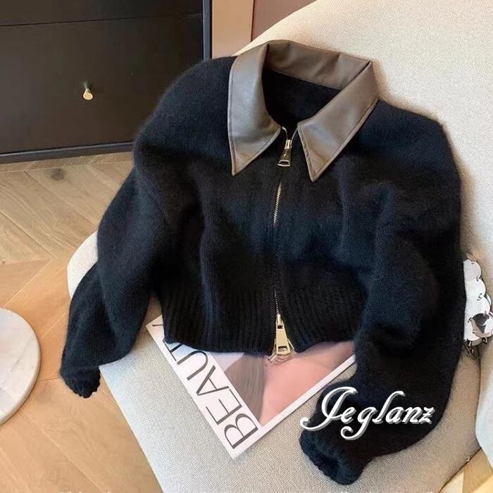 3色 ニット セーター カーディガン モヘア レザー 襟付き ジップ(MA690)σ,ς*