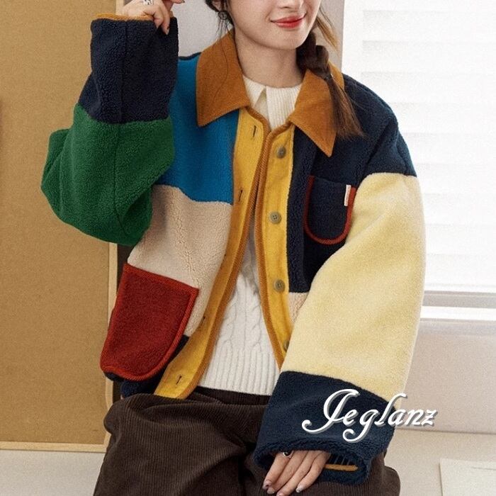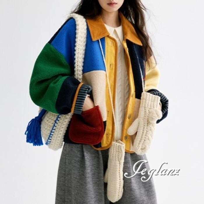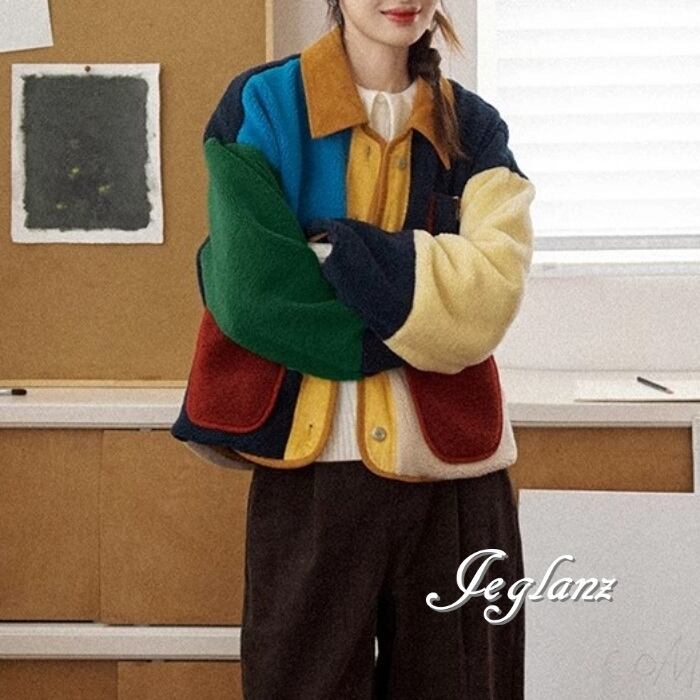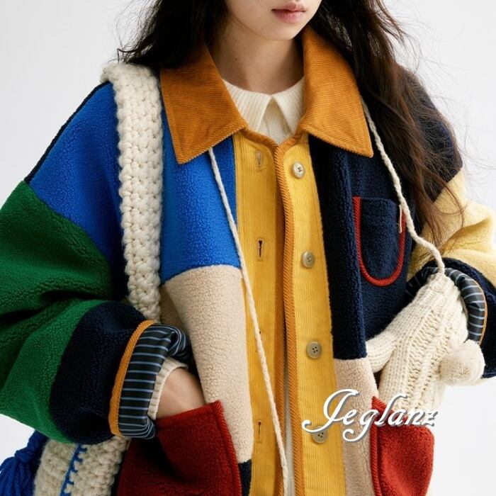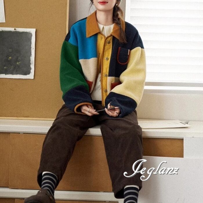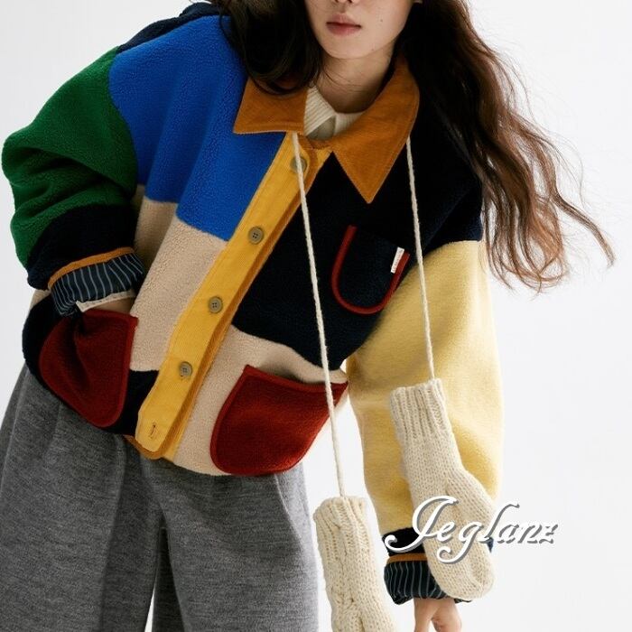 2色 ボア ニット ジャケット 襟付き カラーブロック レトロ感 ♪(MA719)τ