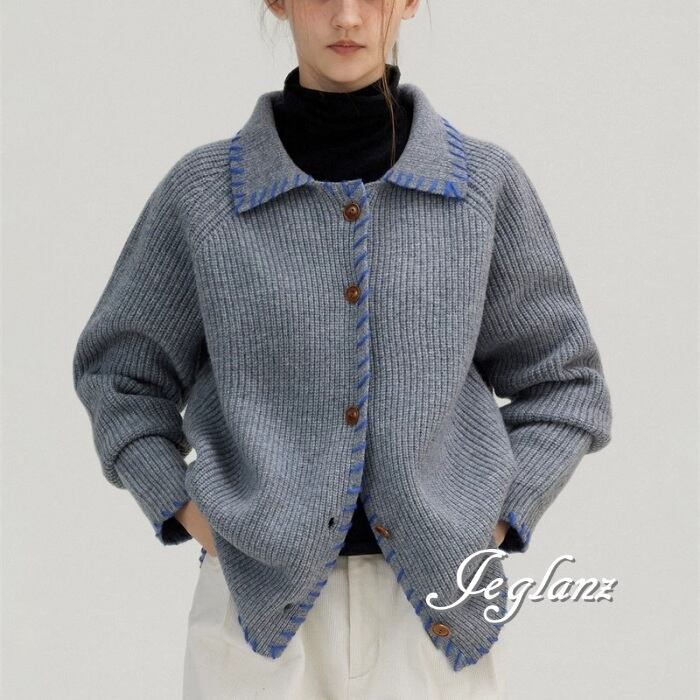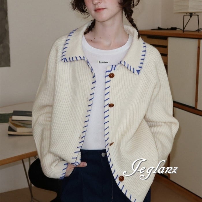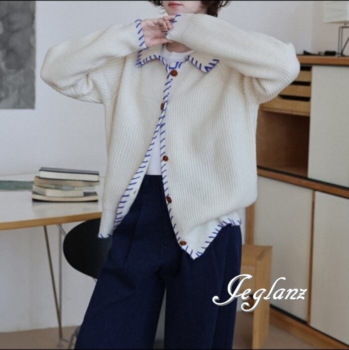 2色 リブ ニット 襟付き カーディガン 編み込み ボタン ♪(MA727)σ,ς*