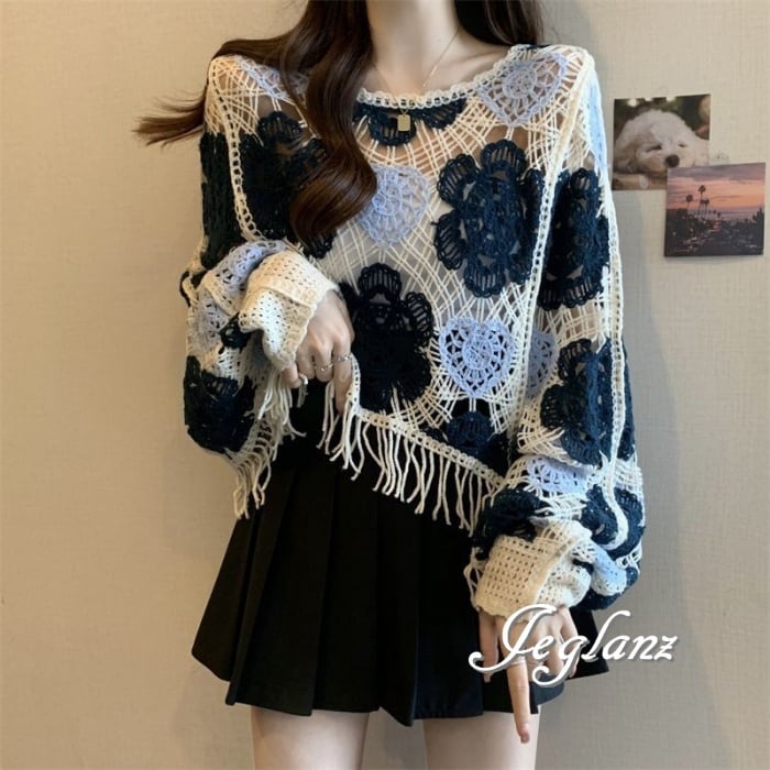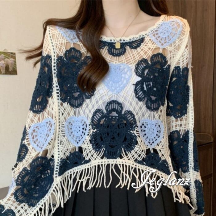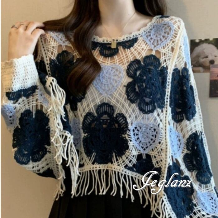 かぎ編み ニット クロシェ編み フリンジ 配色 ファンシー(MA728)ρ