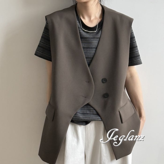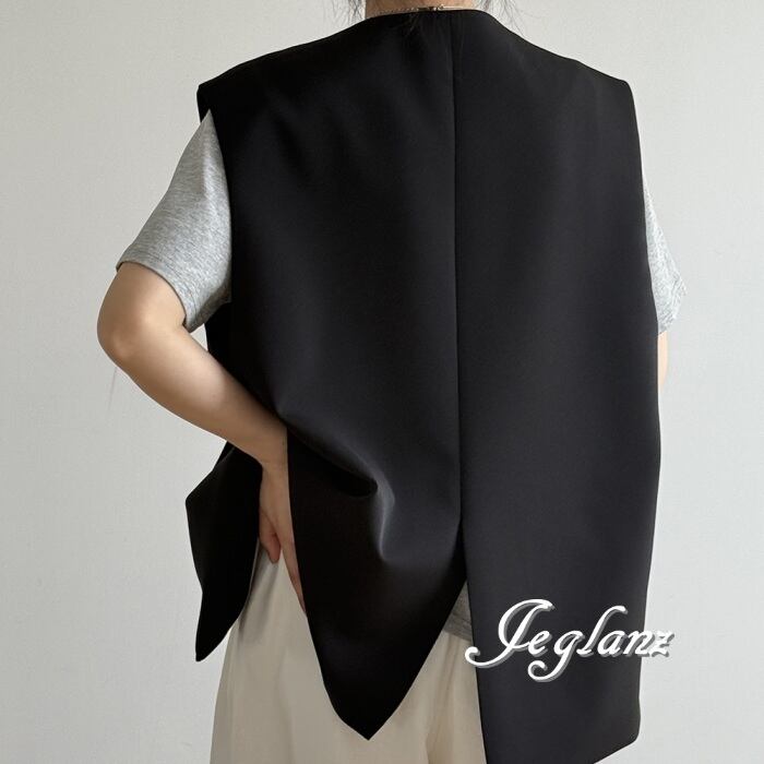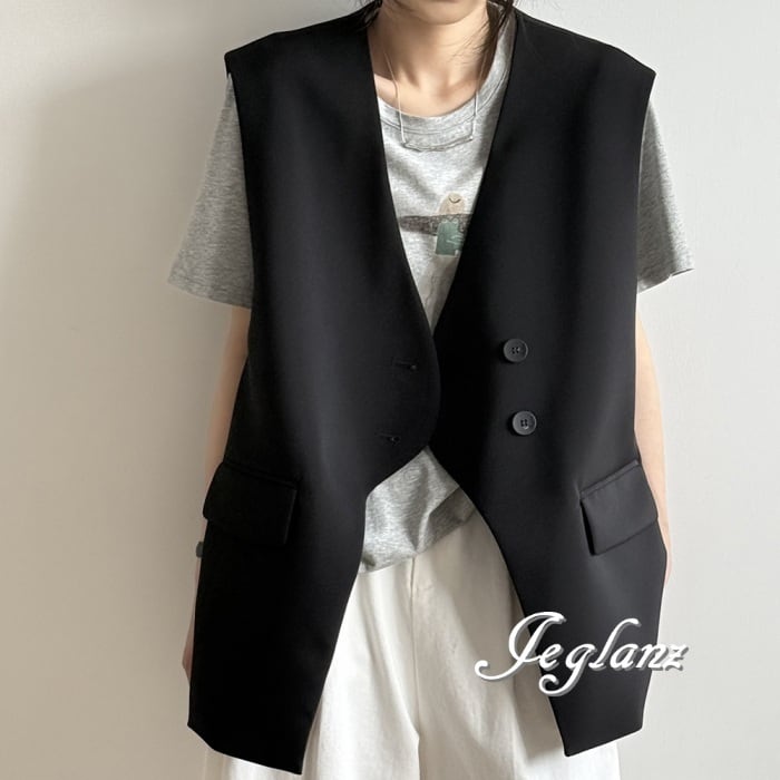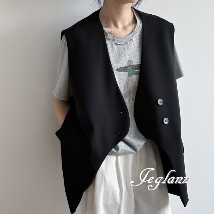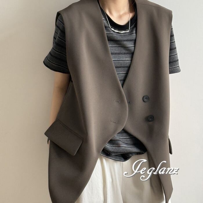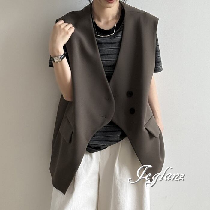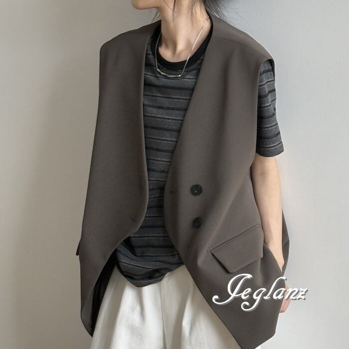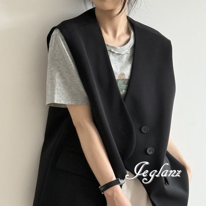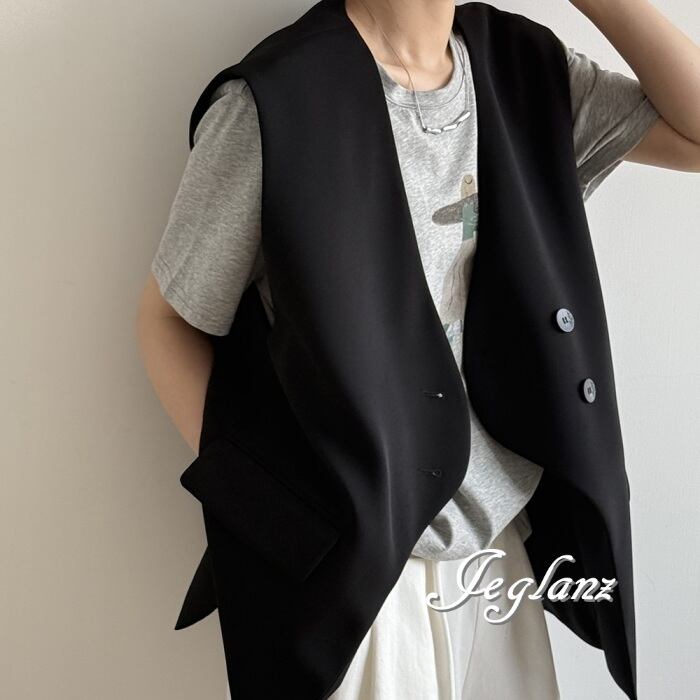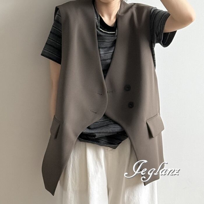 2色 ロングジレ ベスト ダブルブレスト ノーカラー エッジィ ♪(MA750)τ