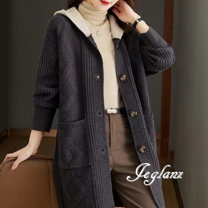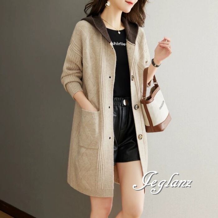 4色 バイカラー ニット コート 羽織り フード付き カジュアル派(MA796)τ