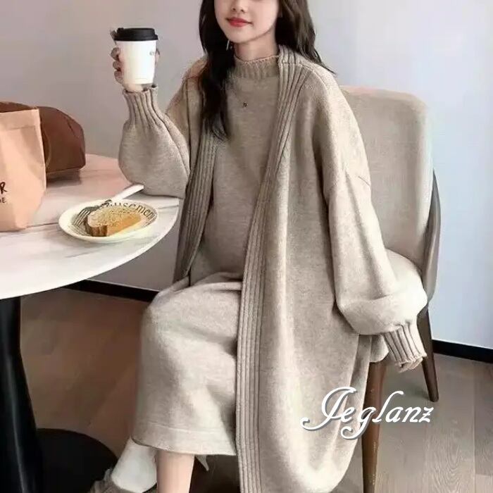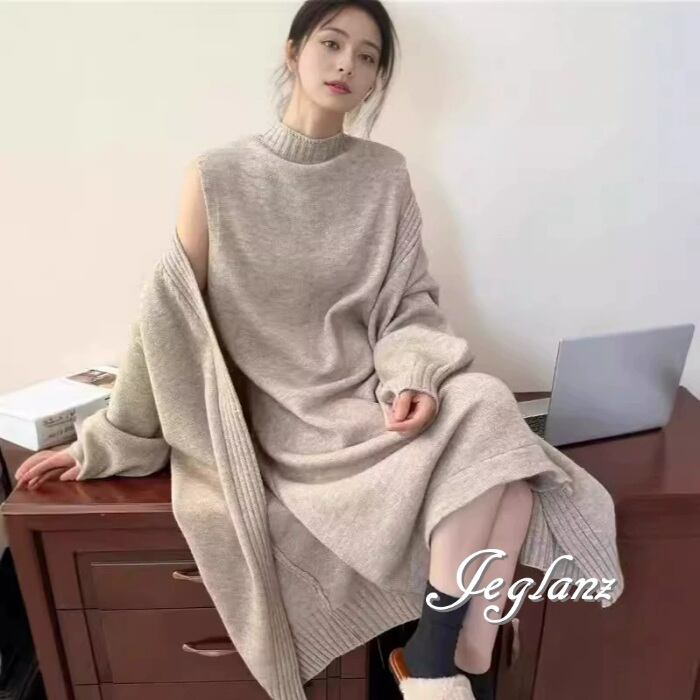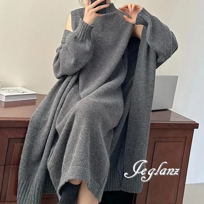 セットアップ 2点 ニット ロング カーデ ハイネック 袖なし ワンピース 3色(MA830)λ