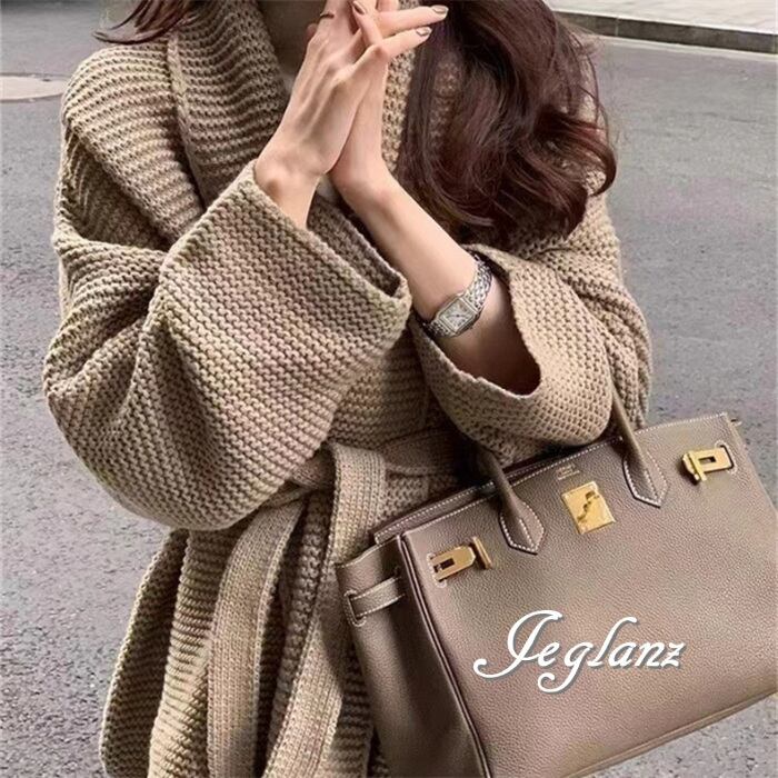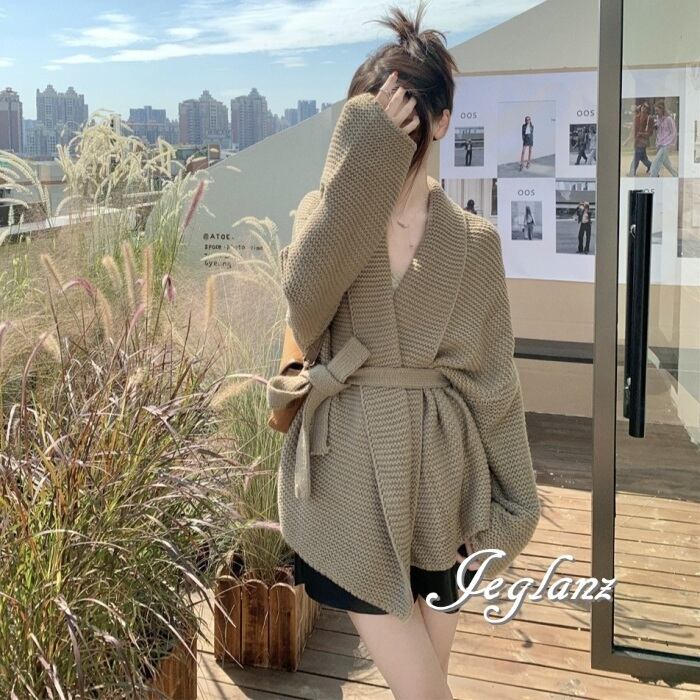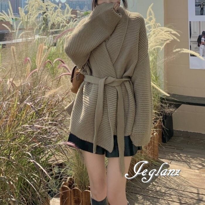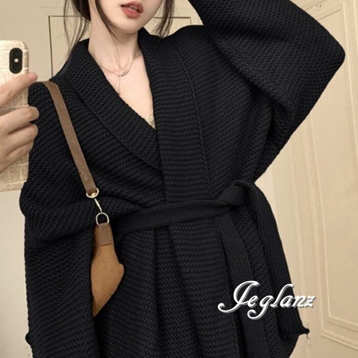 3色 ニット カーディガン ショールカラー 羽織り ノーボタン 共ベルト(MA878)τ