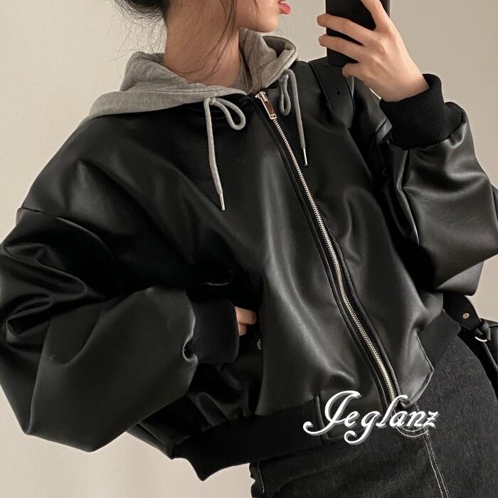 革ジャン レザー ジャケット 異素材 フード付 ライダース ジップ(MB048)τ