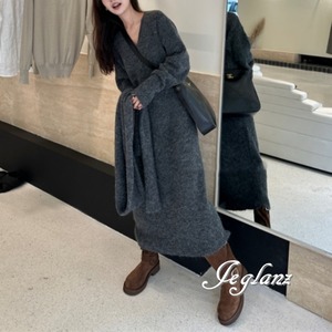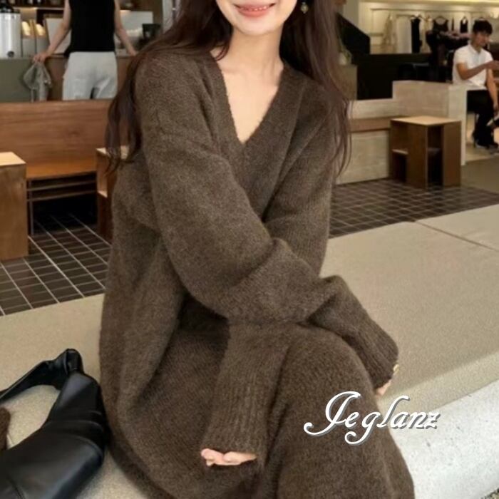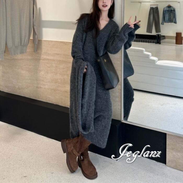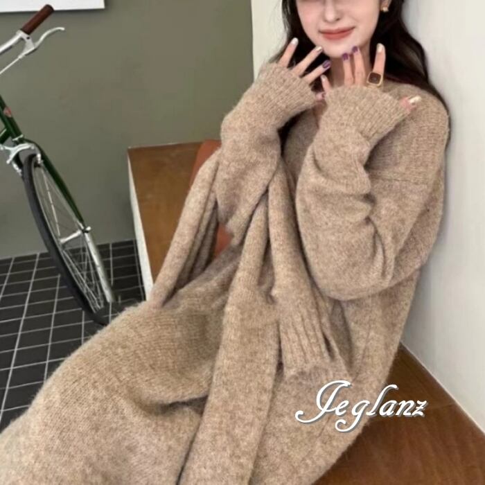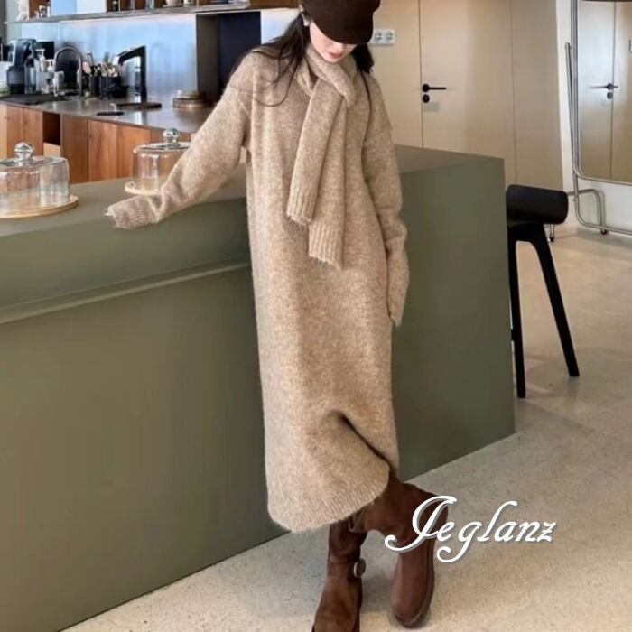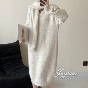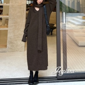 セットアップ 2点 マフラー付き リブ ニット Vネック ワンピース 5色(MB110)μ