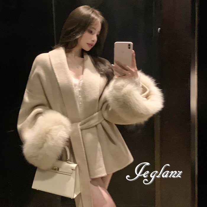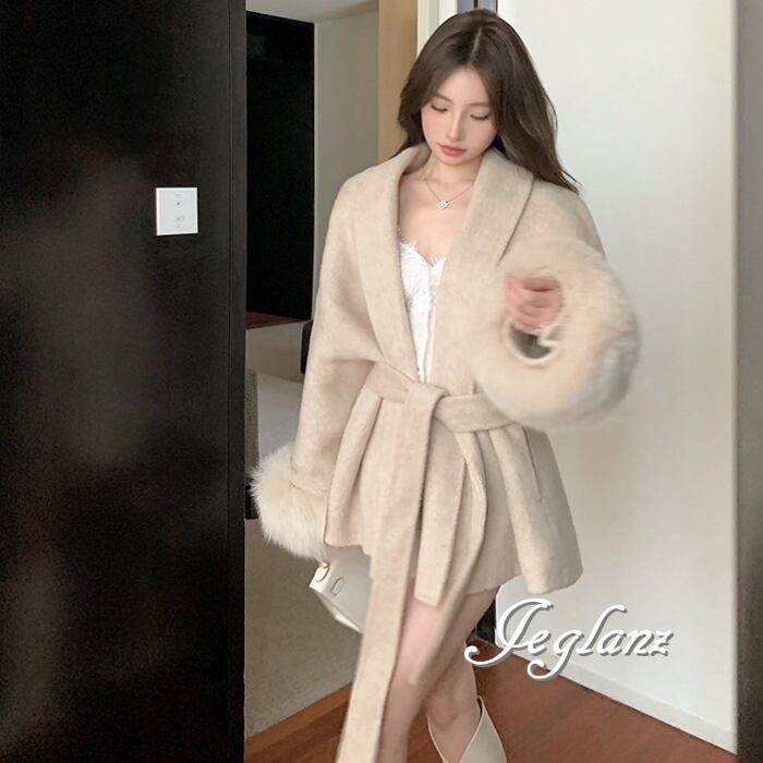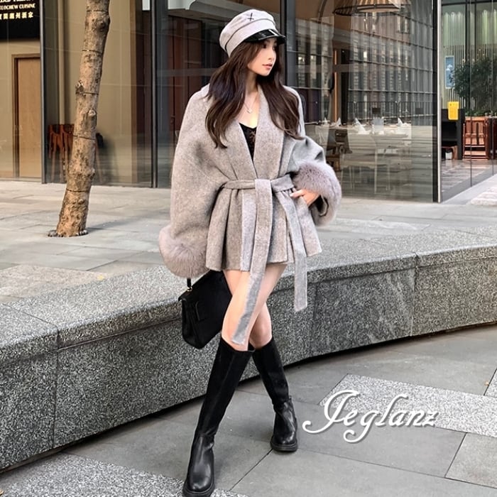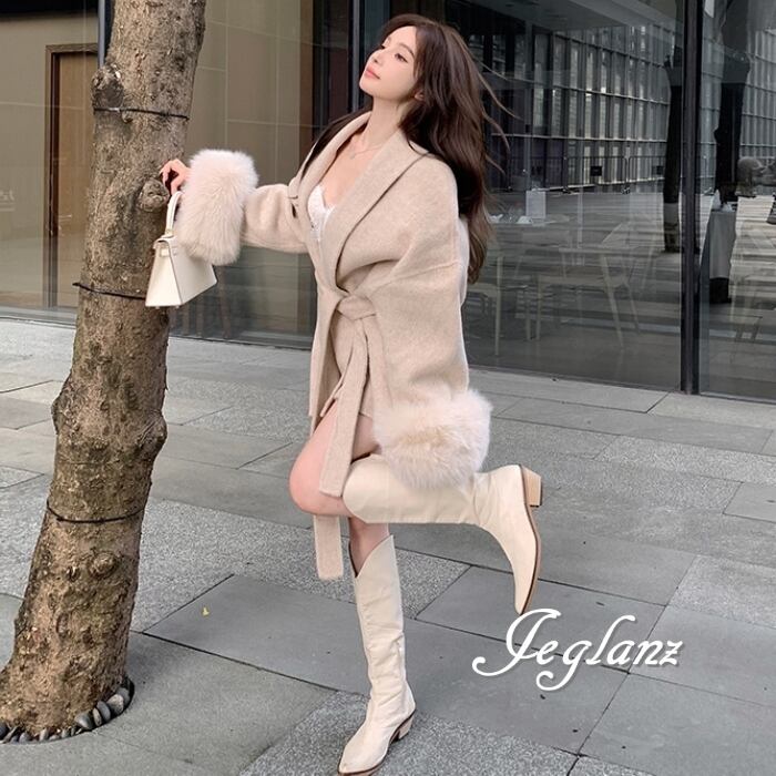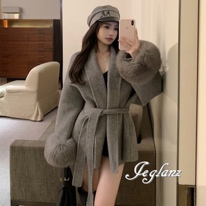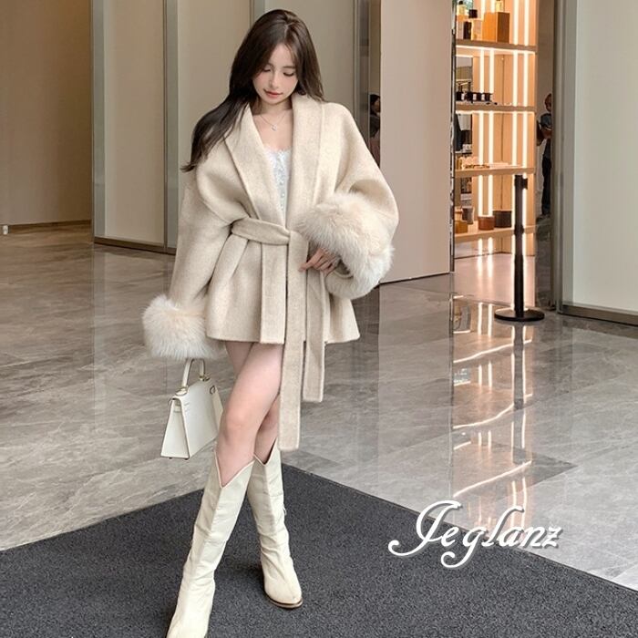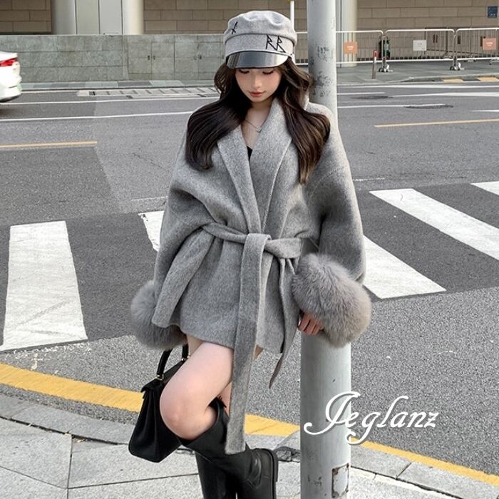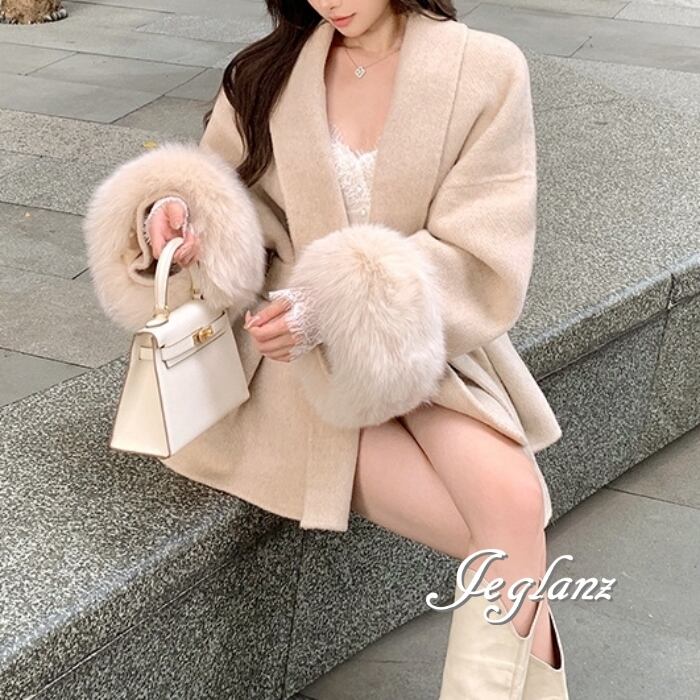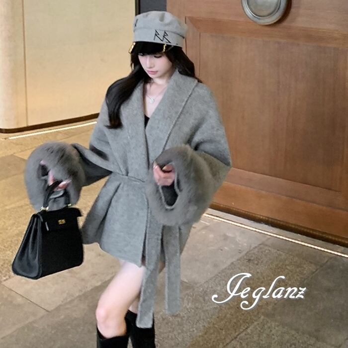 ハーフ丈 ニット コート 襟付き ボリュームファー 共ベルト 2色(MB280)τ