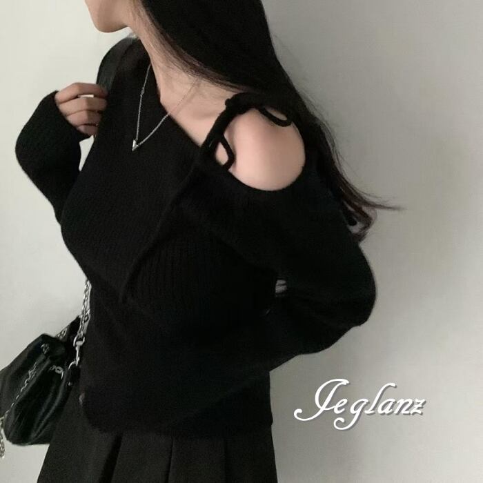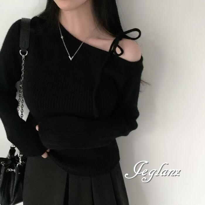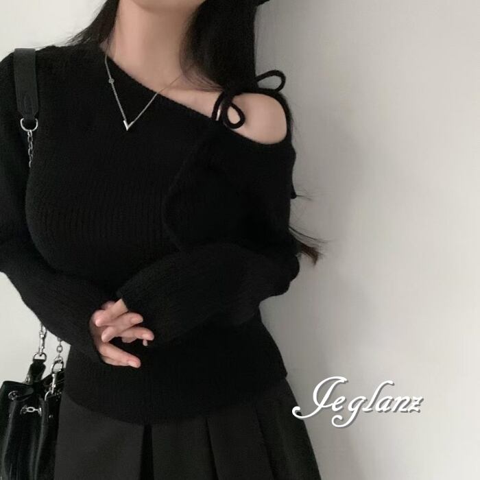 3色 ニット カットソー ワンショル 肩リボン アシメ (MB458)σ,ς*