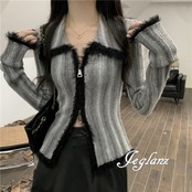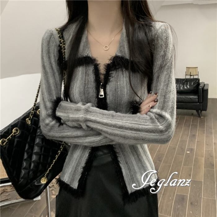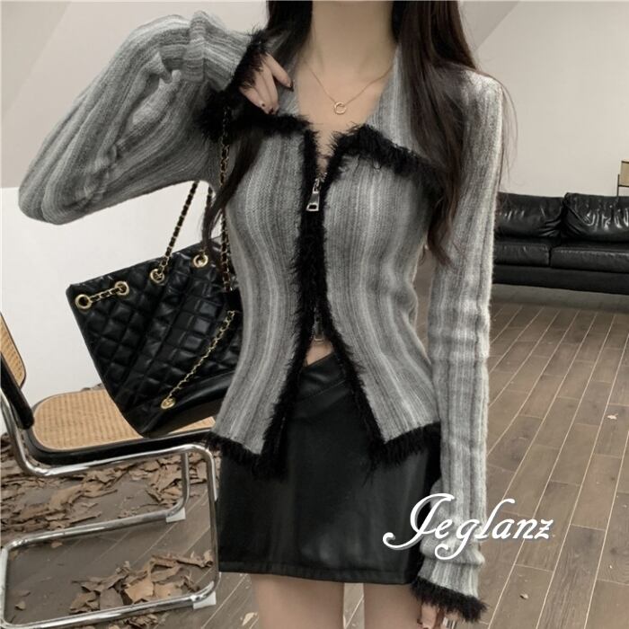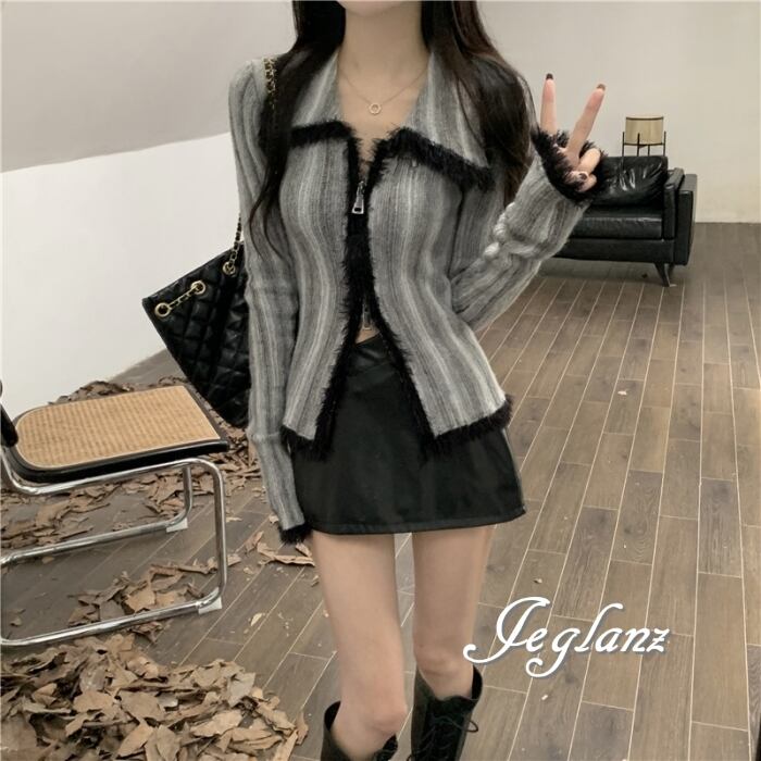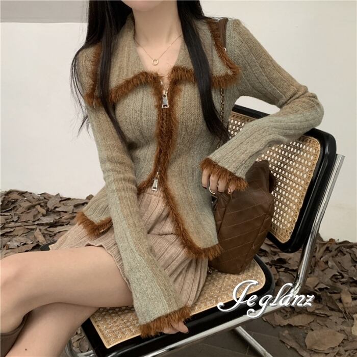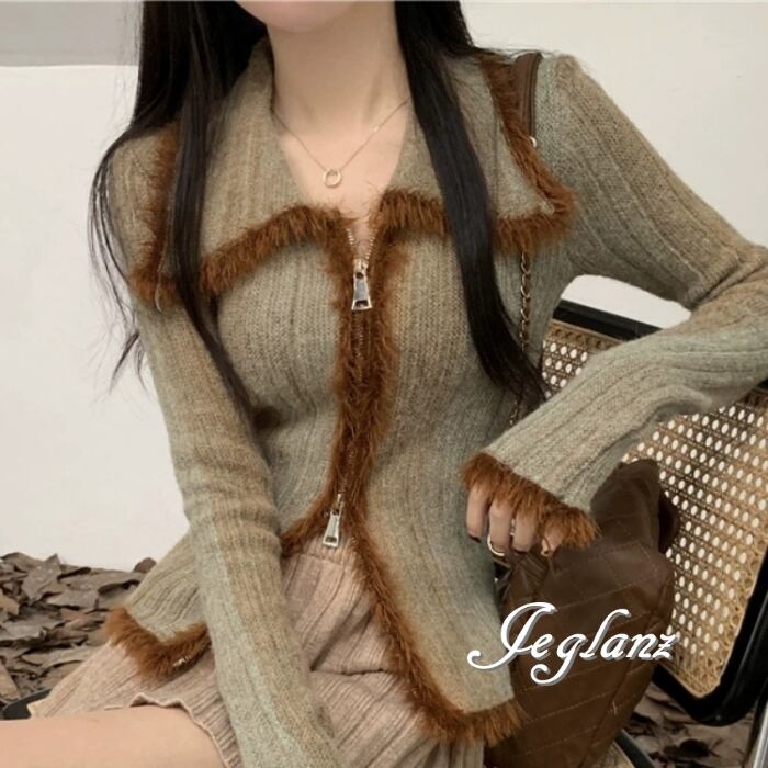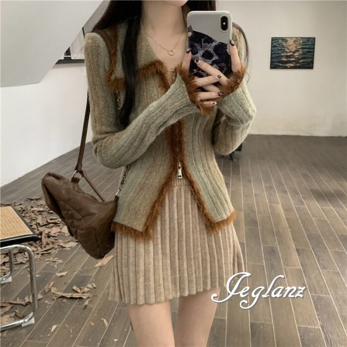 2色 ニット カーディガン 羽織り 襟付き ジップ フェザー (MB459)σ,ς*