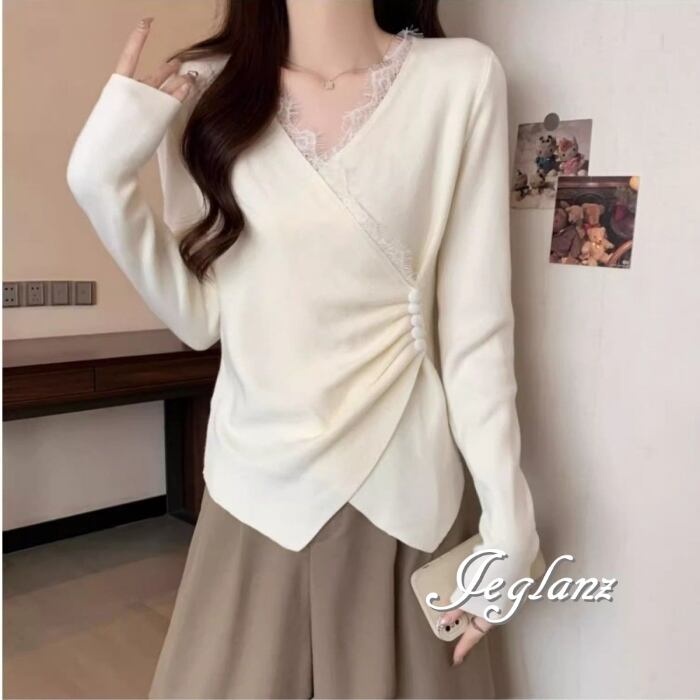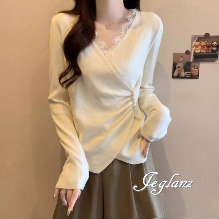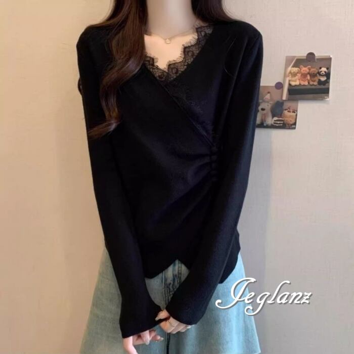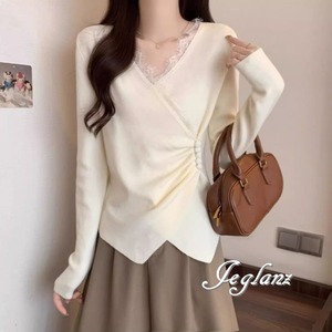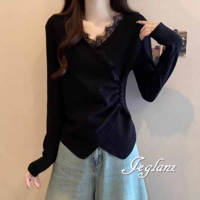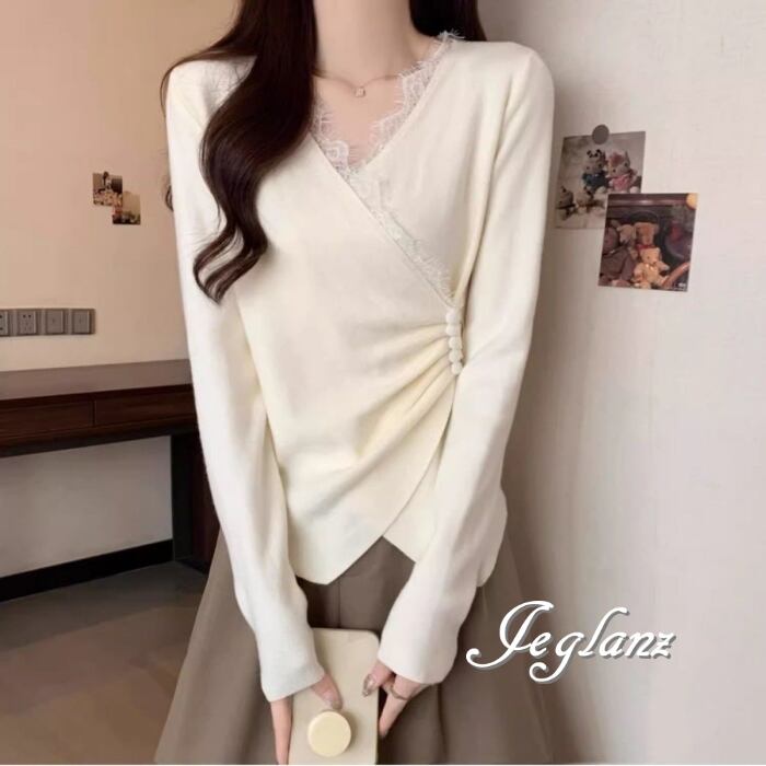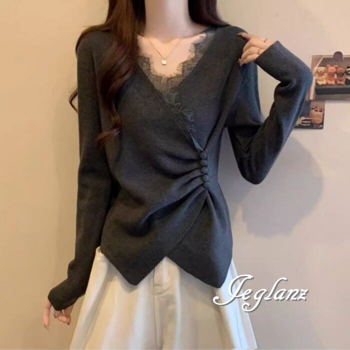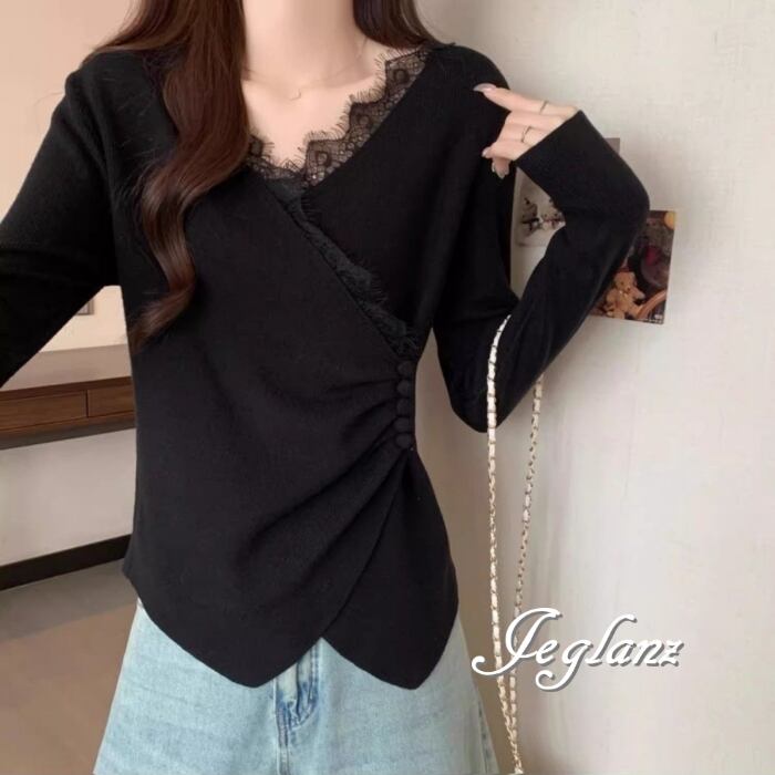 3色 ニット カットソー 切替 レース 刺繍 Vネック ボタン(MB496)σ,ς*