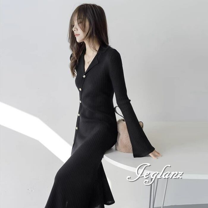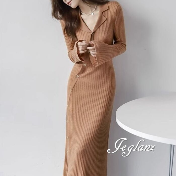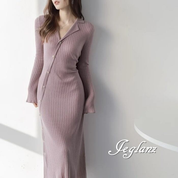 4色 ニット ワンピース オープンカラー ボタン シンプル派(MB588)γ