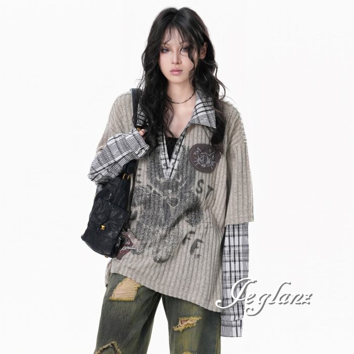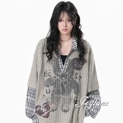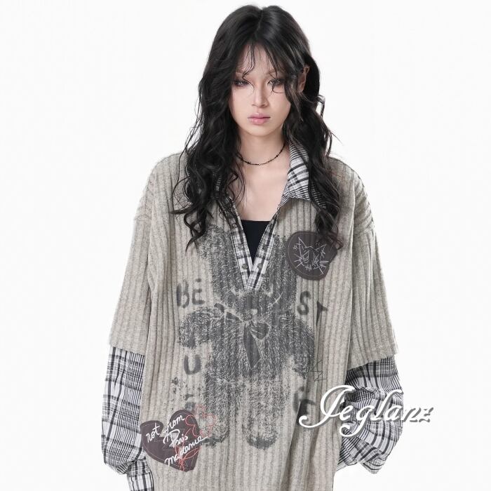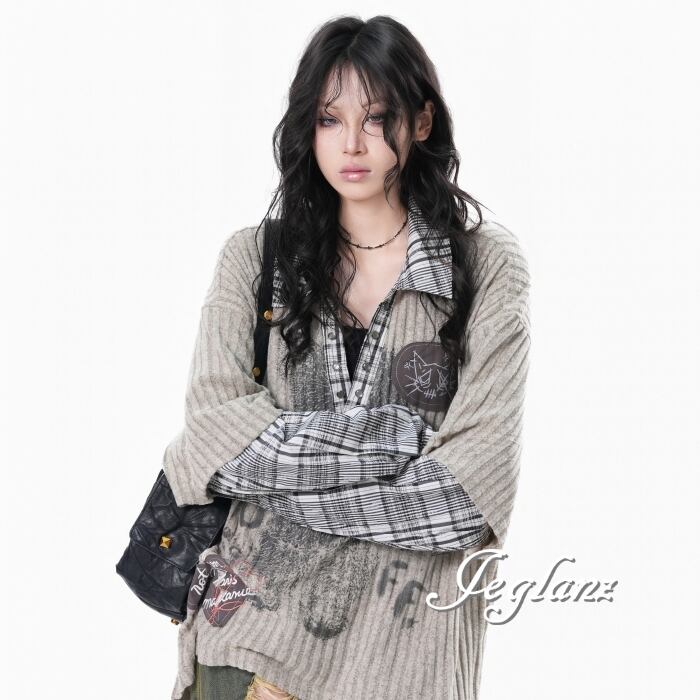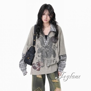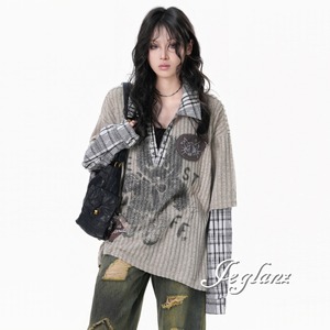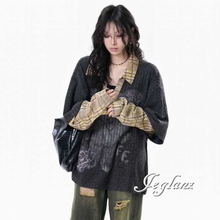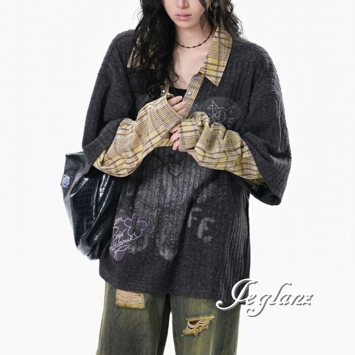 2色 ニット フェイク レイヤード イラスト チェック カジュアル( MB739)σ,ς*