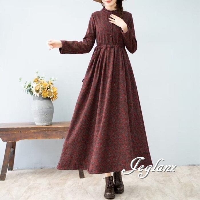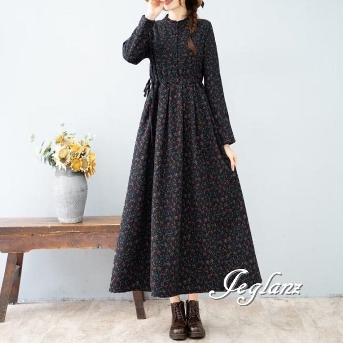 2色 小花柄 ロング ワンピース 長袖 ボタン ドロスト フェミニン(MB770)τ