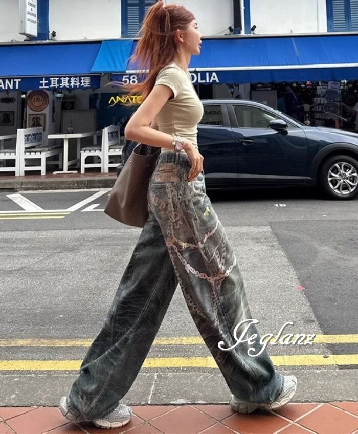 ミックス チェーン デザイン デニム カジュアル ワイド パンツ(MB920)
