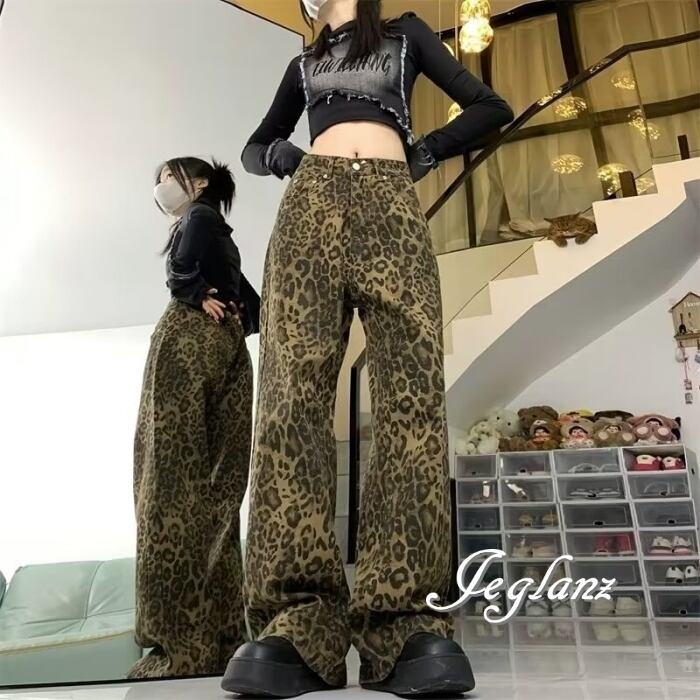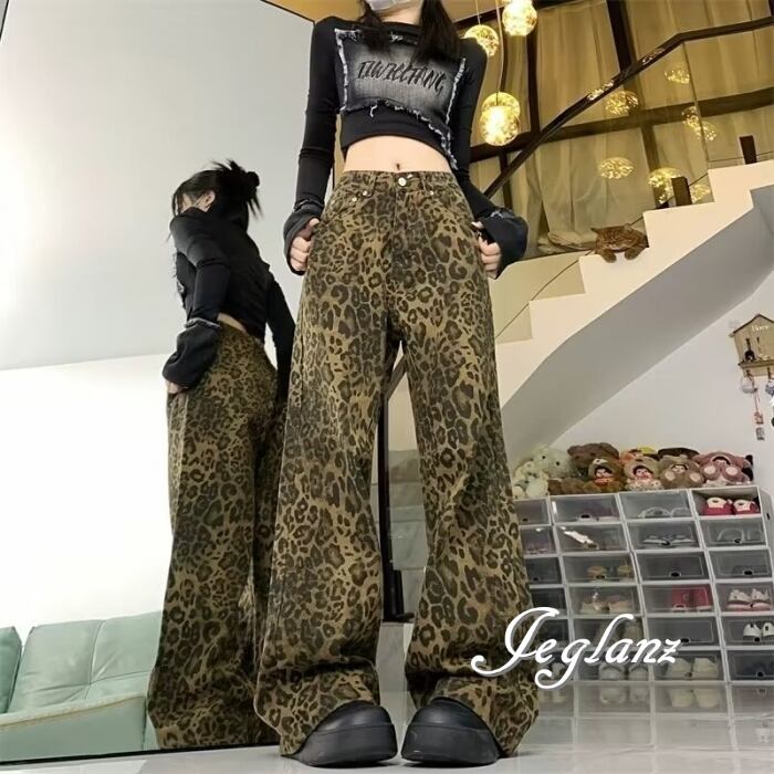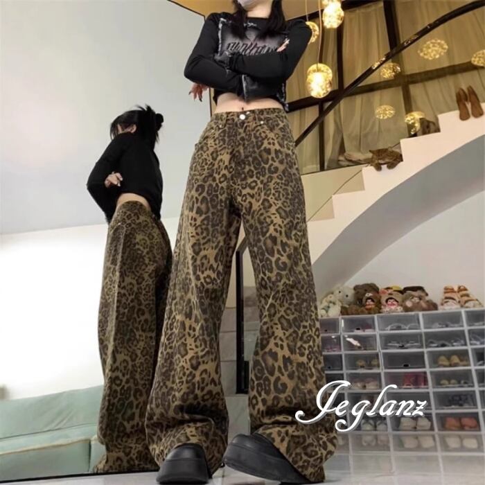 レオパード柄 ストレート ロゴ カジュアル パンツ ユニセックス(MB927)