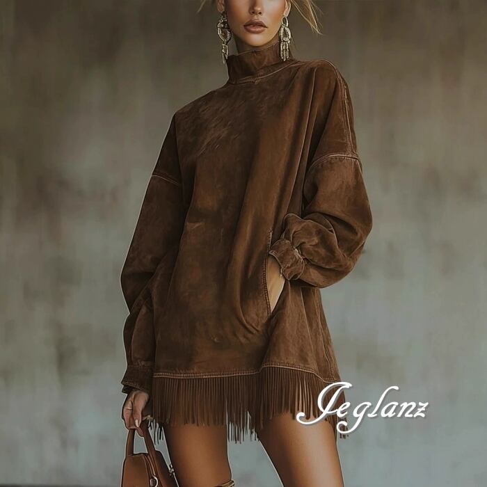 4色 フリンジ チュニック ワンピース 長袖 スエード調 しゃれ感(MB986)ρ