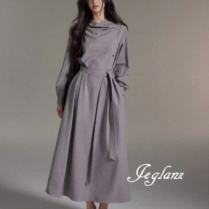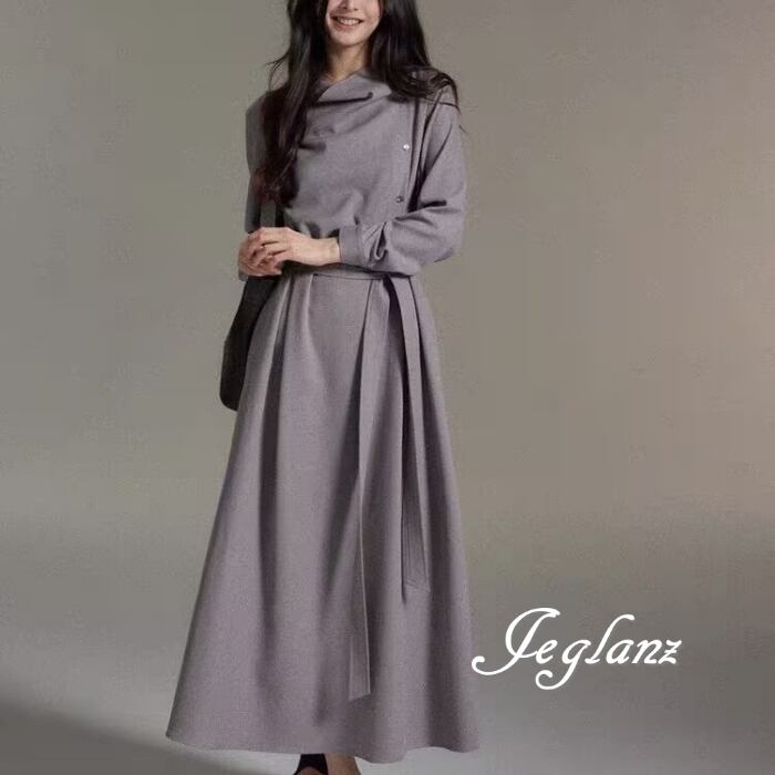 2色 マキシ ワンピース 長袖 ドレープ ハイネック 共ベルト 上品(MC027)γα
