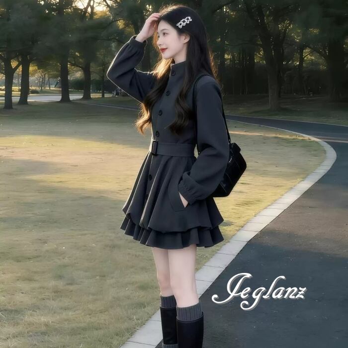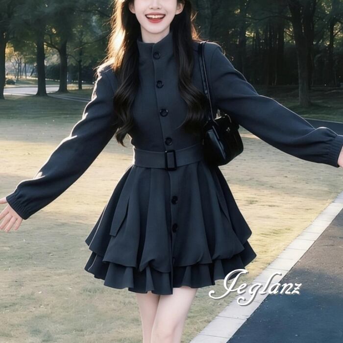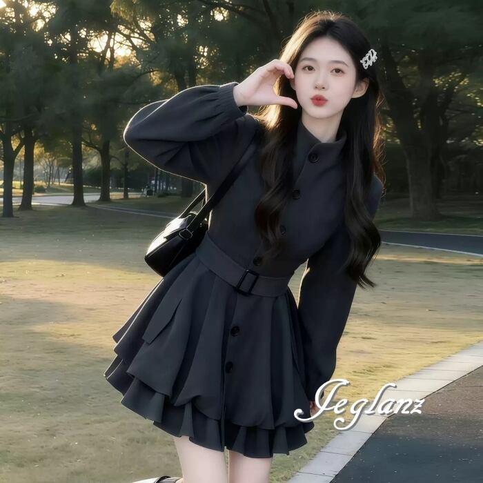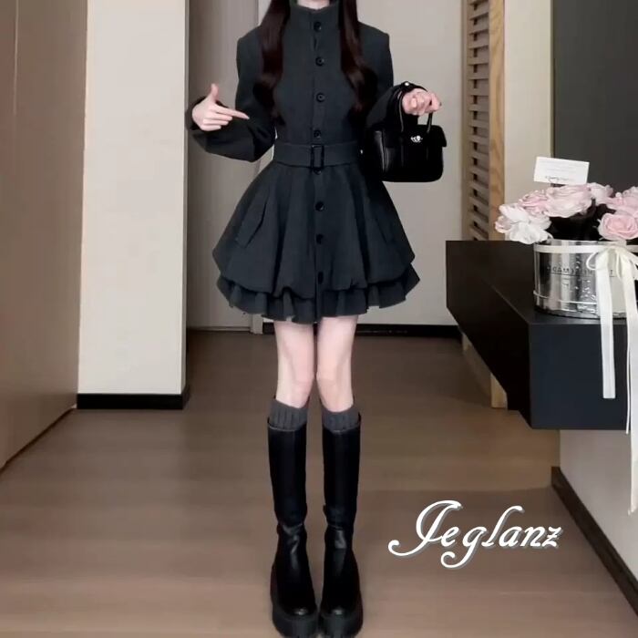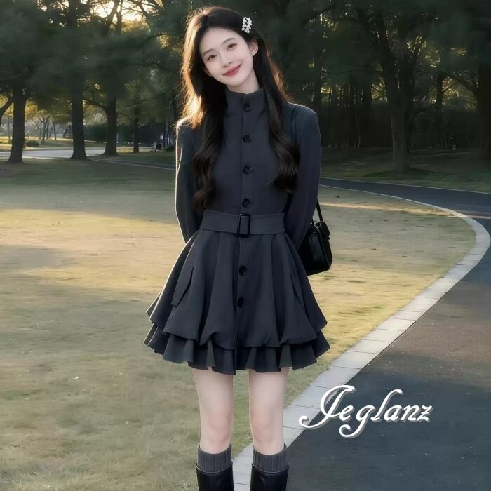 レイヤード ワンピース 長袖 ハイネック 共ベルト ミニスカ 韓国( MC046)ρ