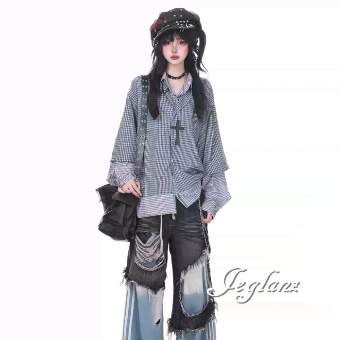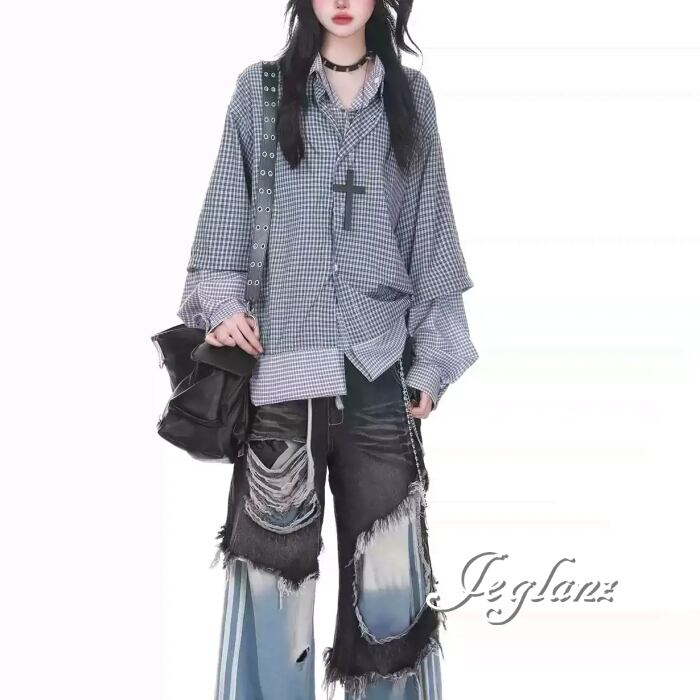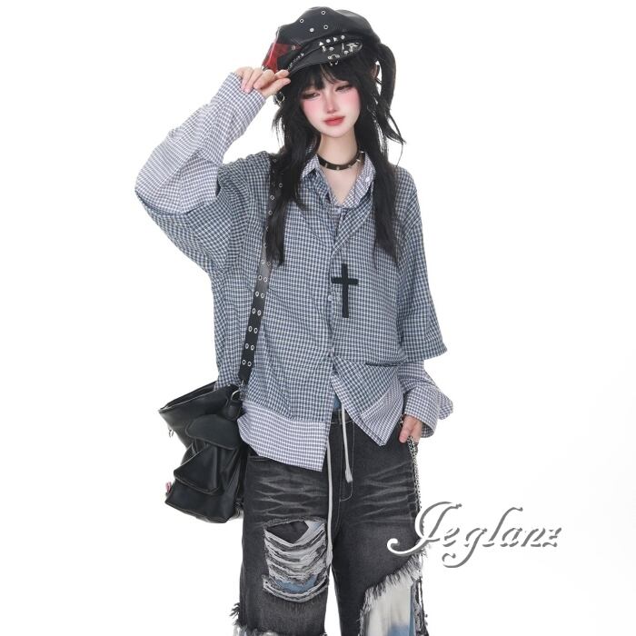 チェック柄 フェイク シャツ 長袖 バイカラー ユニセックス 韓国 (MC057)ρ